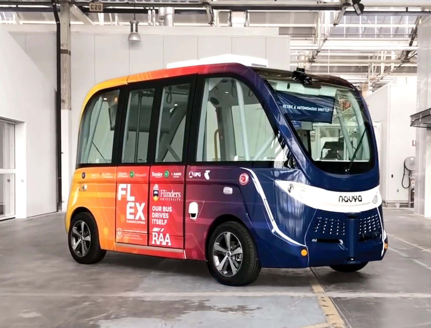 Hughes designed the skin for the new FLEX bus which is an autonomous vehicle driving people around the Tonsley campus.