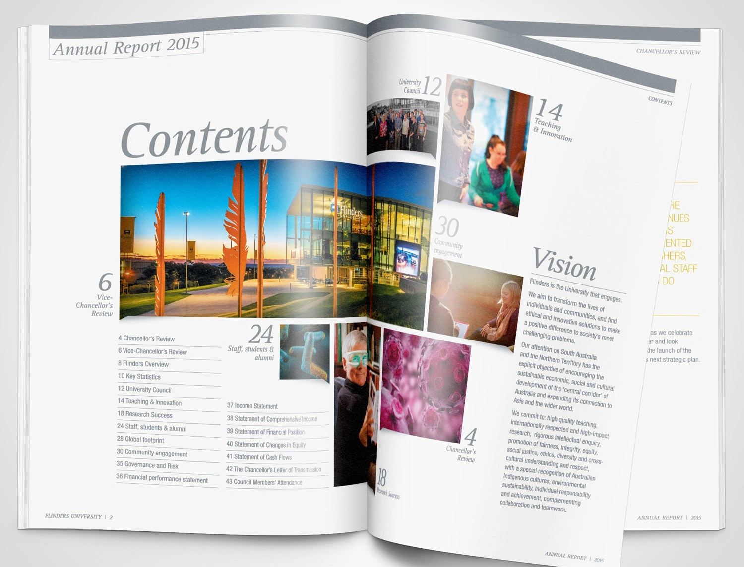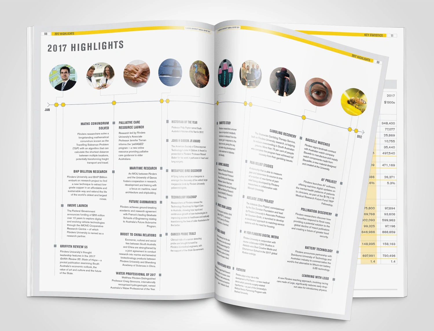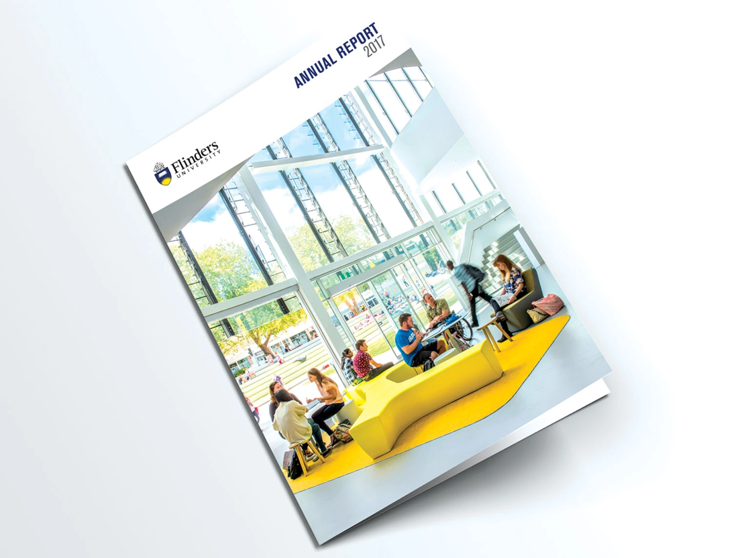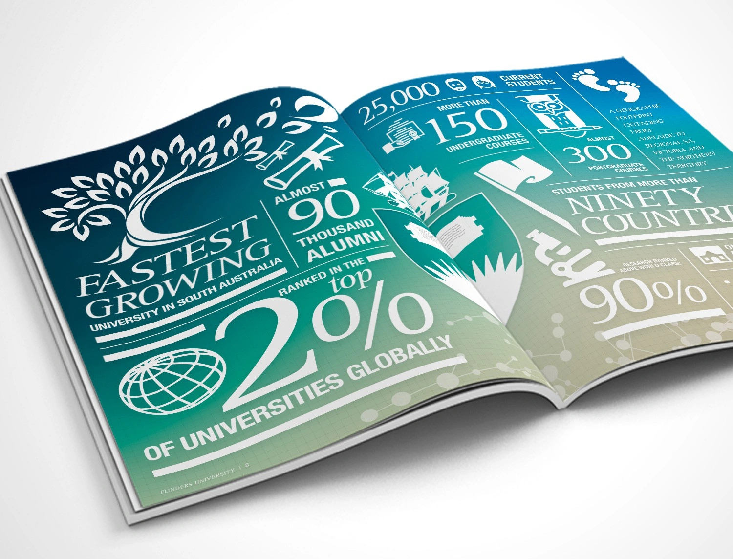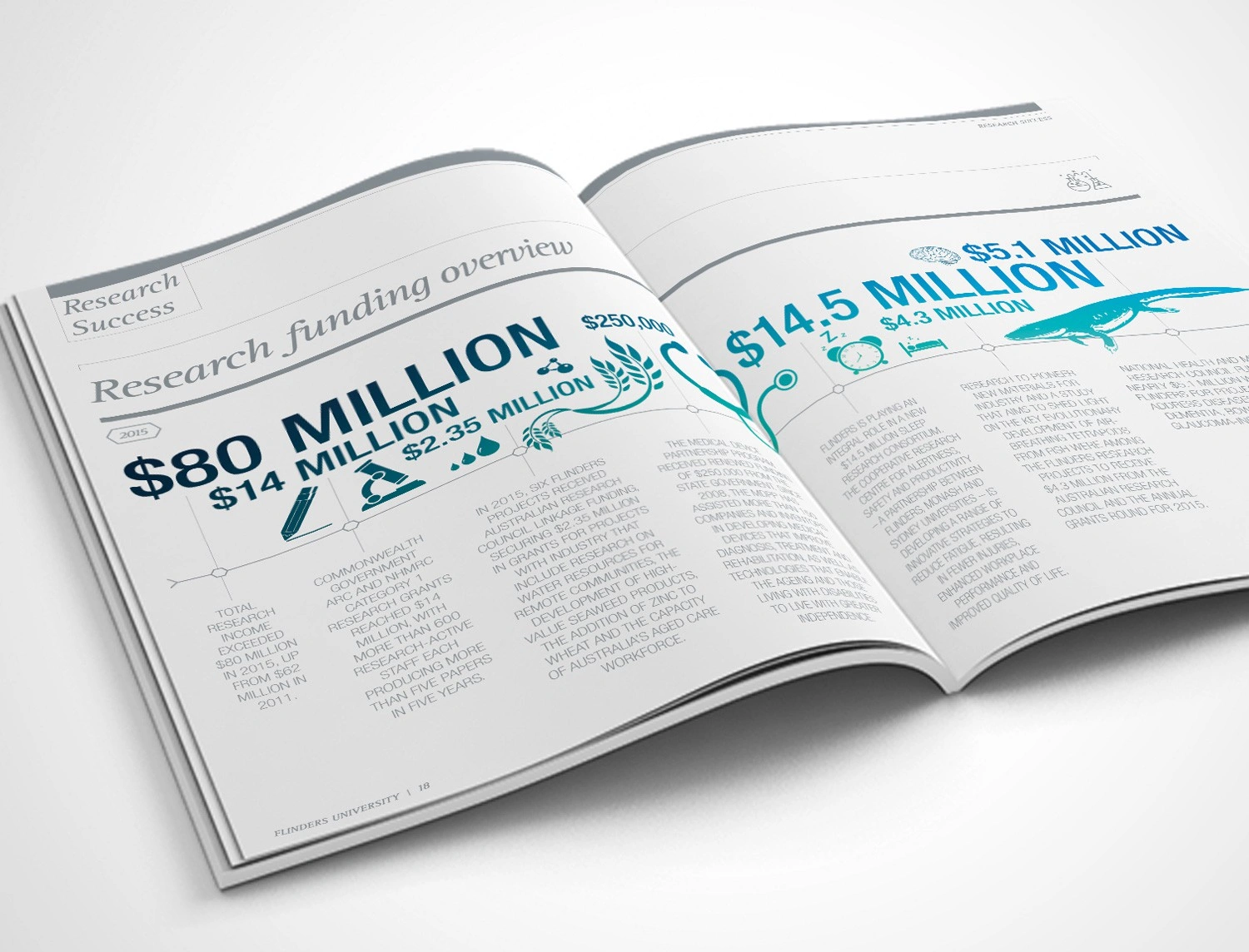 Hughes also designed the Flinders’ 2015 and 2017 Annual Reports to showcase the achievements of the University and its key stakeholders. The initial design drew on elements from the existing style guide to produce a publication with a modern aesthetic reflecting the intellectual rigor of the University. Infographics and charts were also designed to clearly convey the data in a branded and easily interpreted manner.