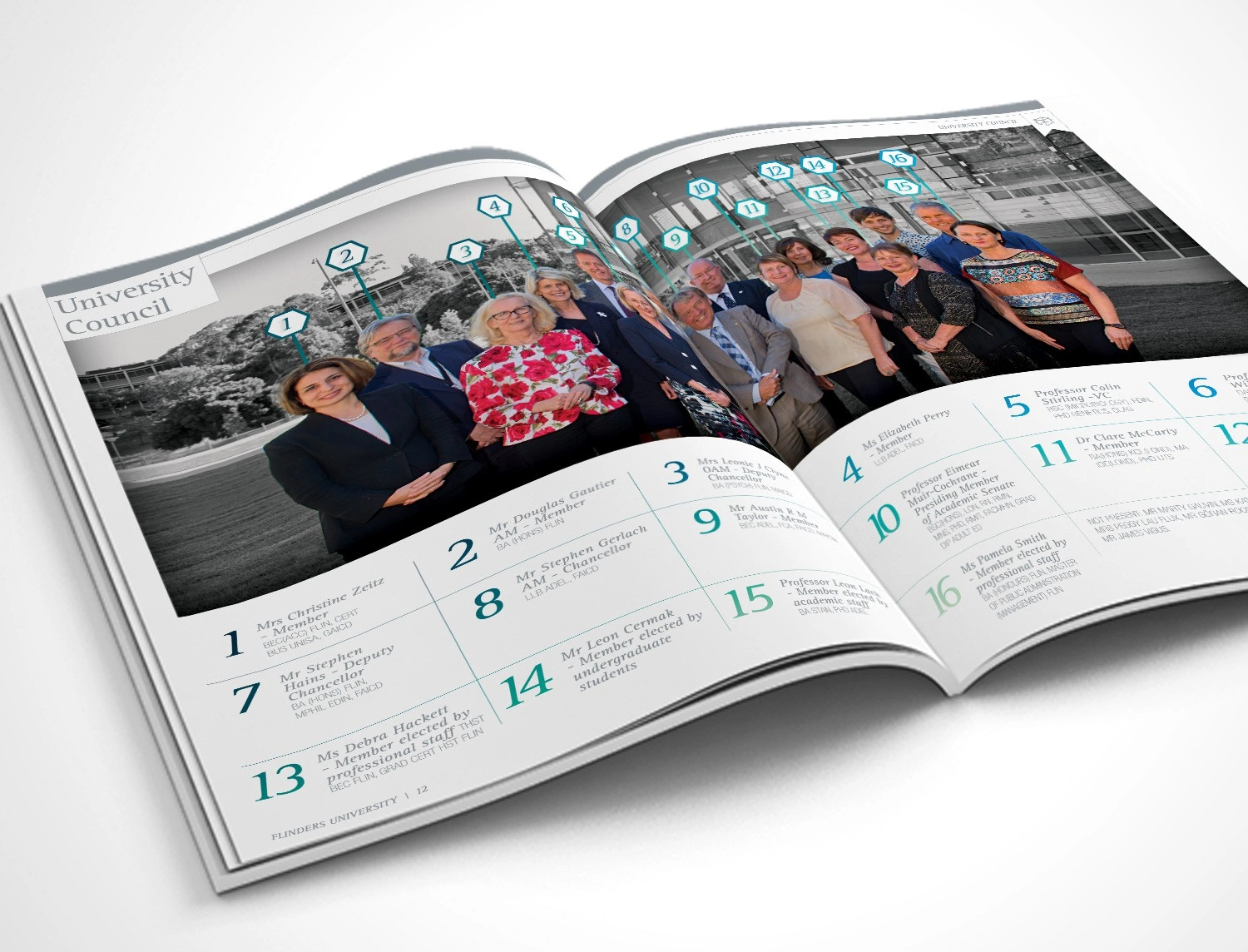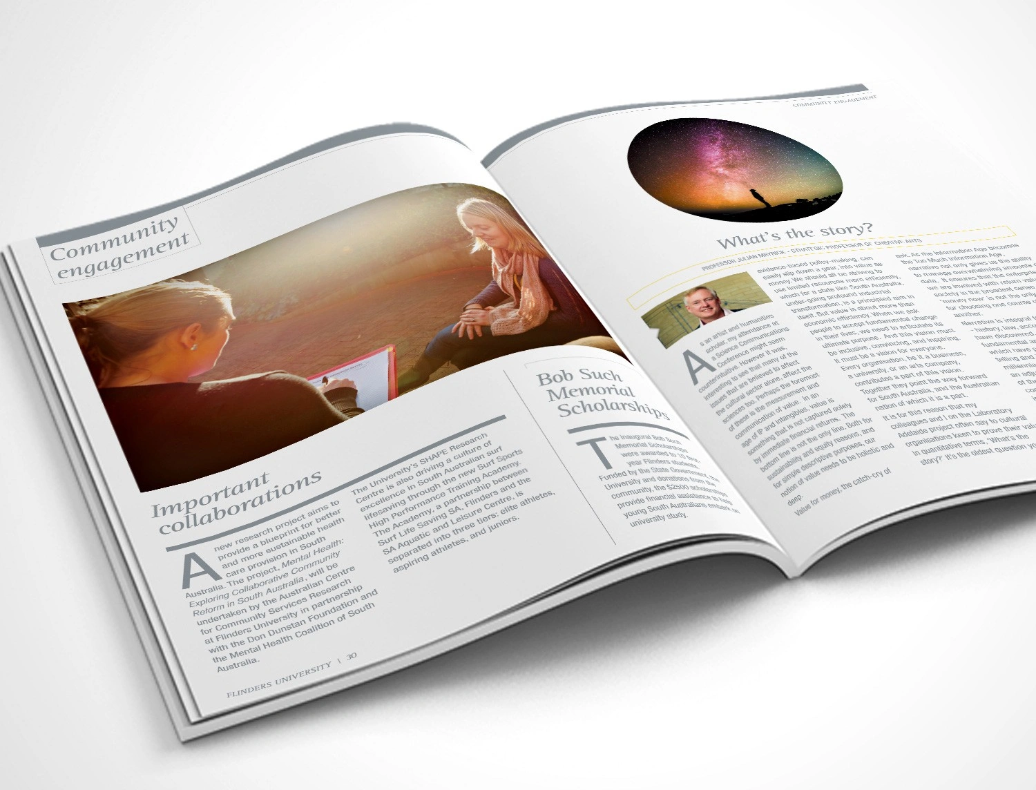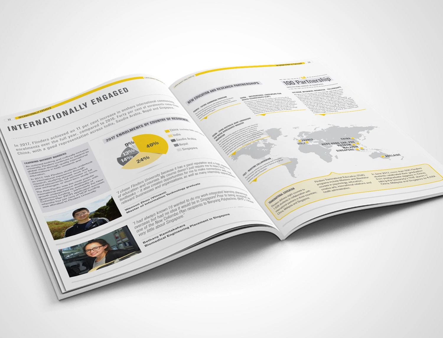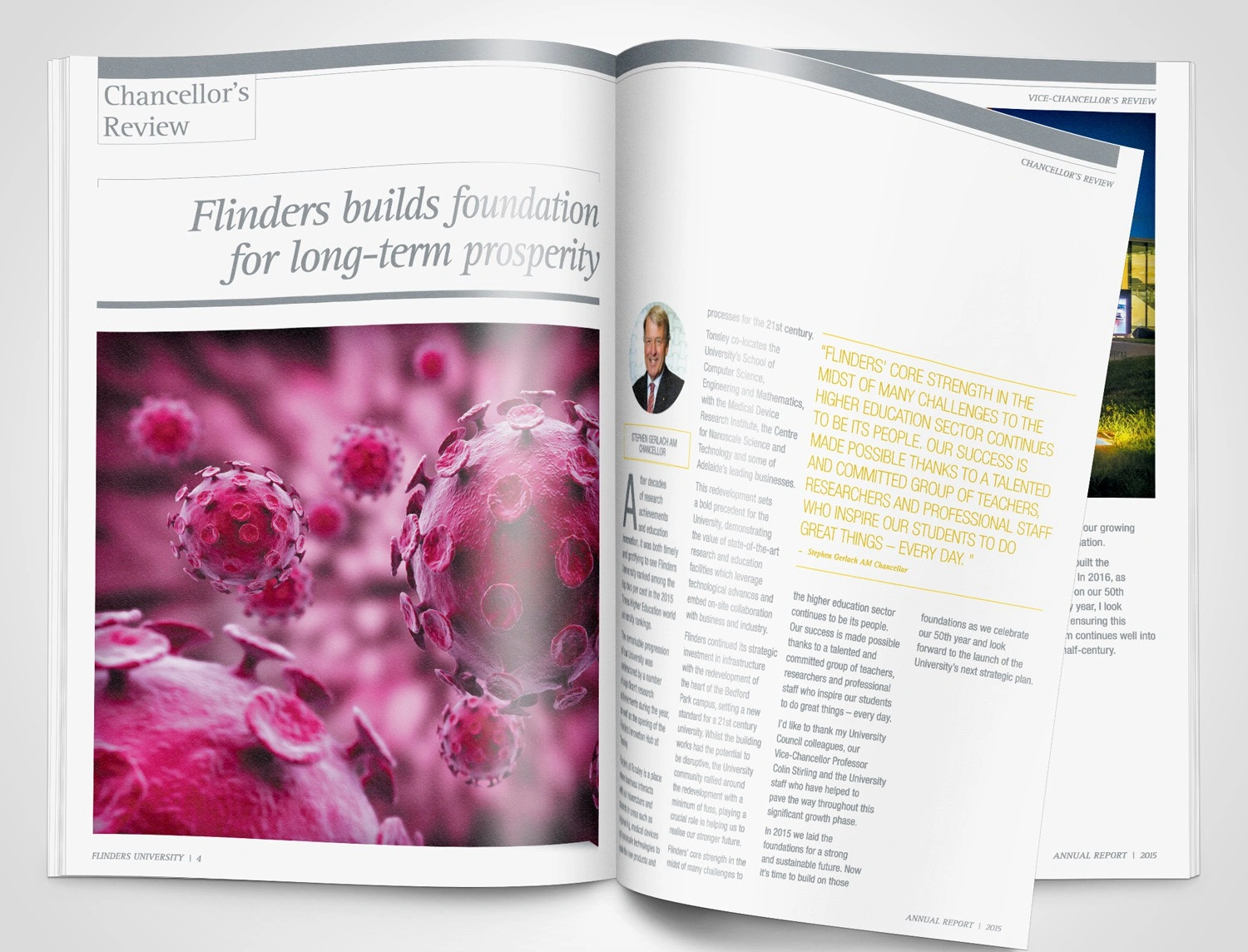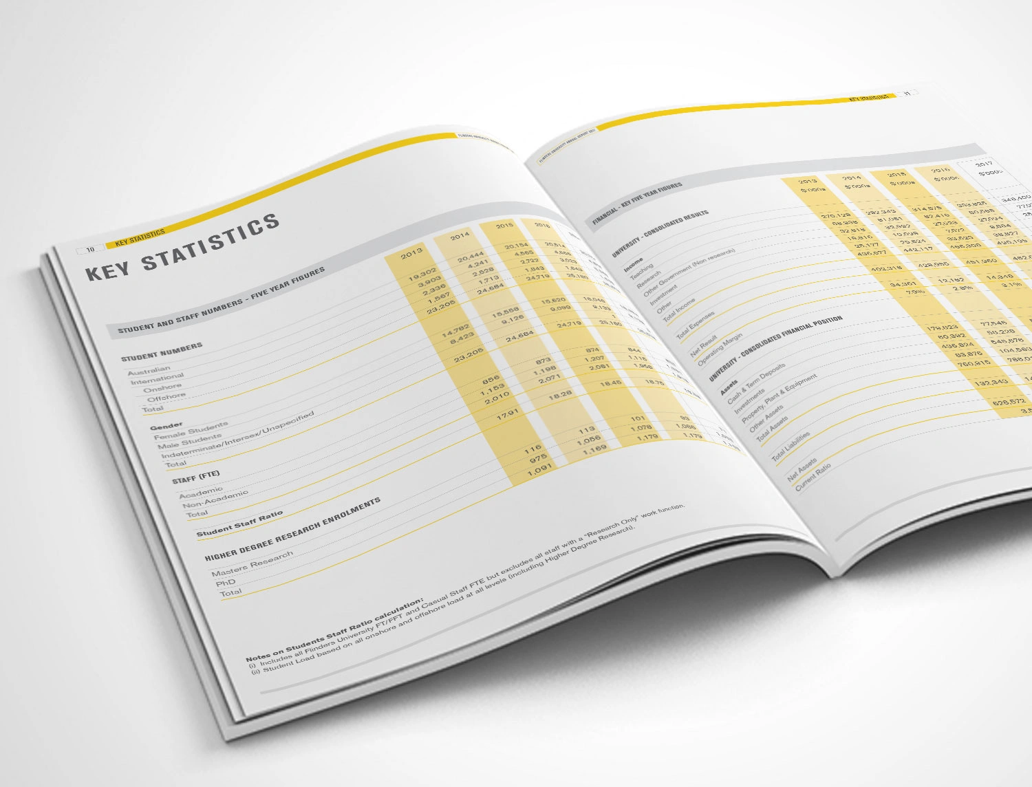 Hughes also designed the Flinders’ 2015 and 2017 Annual Reports to showcase the achievements of the University and its key stakeholders. The initial design drew on elements from the existing style guide to produce a publication with a modern aesthetic reflecting the intellectual rigor of the University. Infographics and charts were also designed to clearly convey the data in a branded and easily interpreted manner.