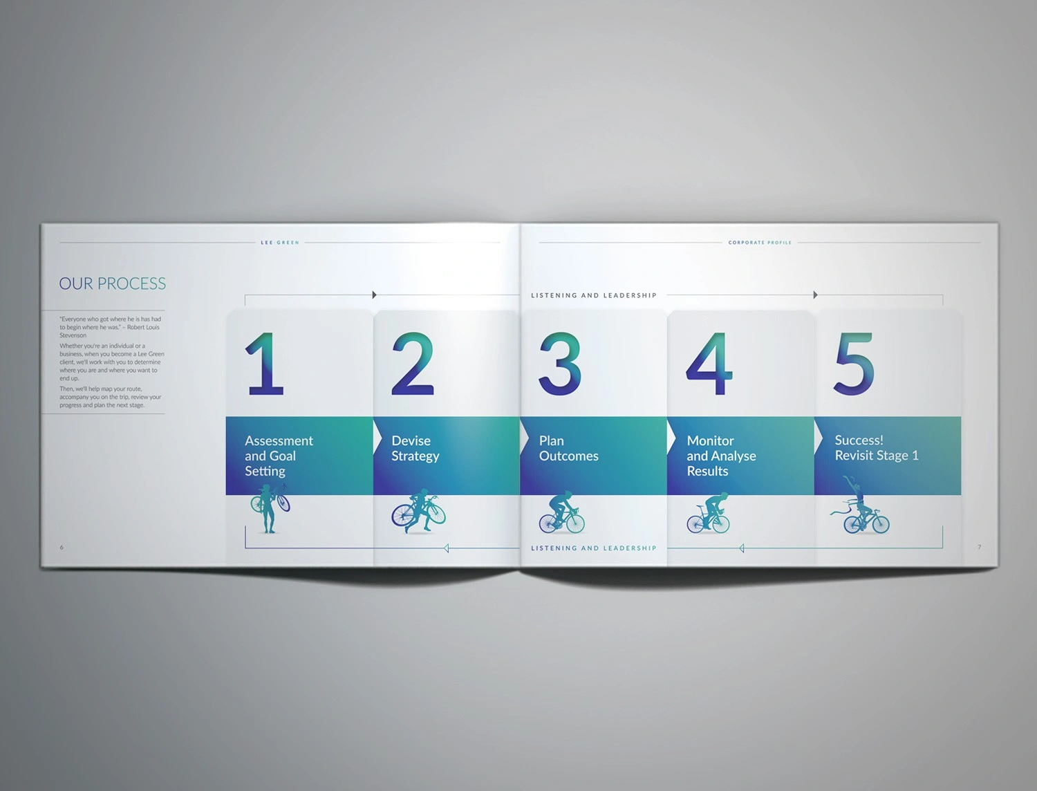 Lee Green was established more than 25 years ago and is now recognised as a respected mid-tier professional services company providing high quality accounting, tax, audit and advisory services. We developed a brochure using a playful “bike” theme which told the story of a journey and incorporated infographics as well as stylised photography. We also designed a website for them which reflected the brand changes and expansion of the company.