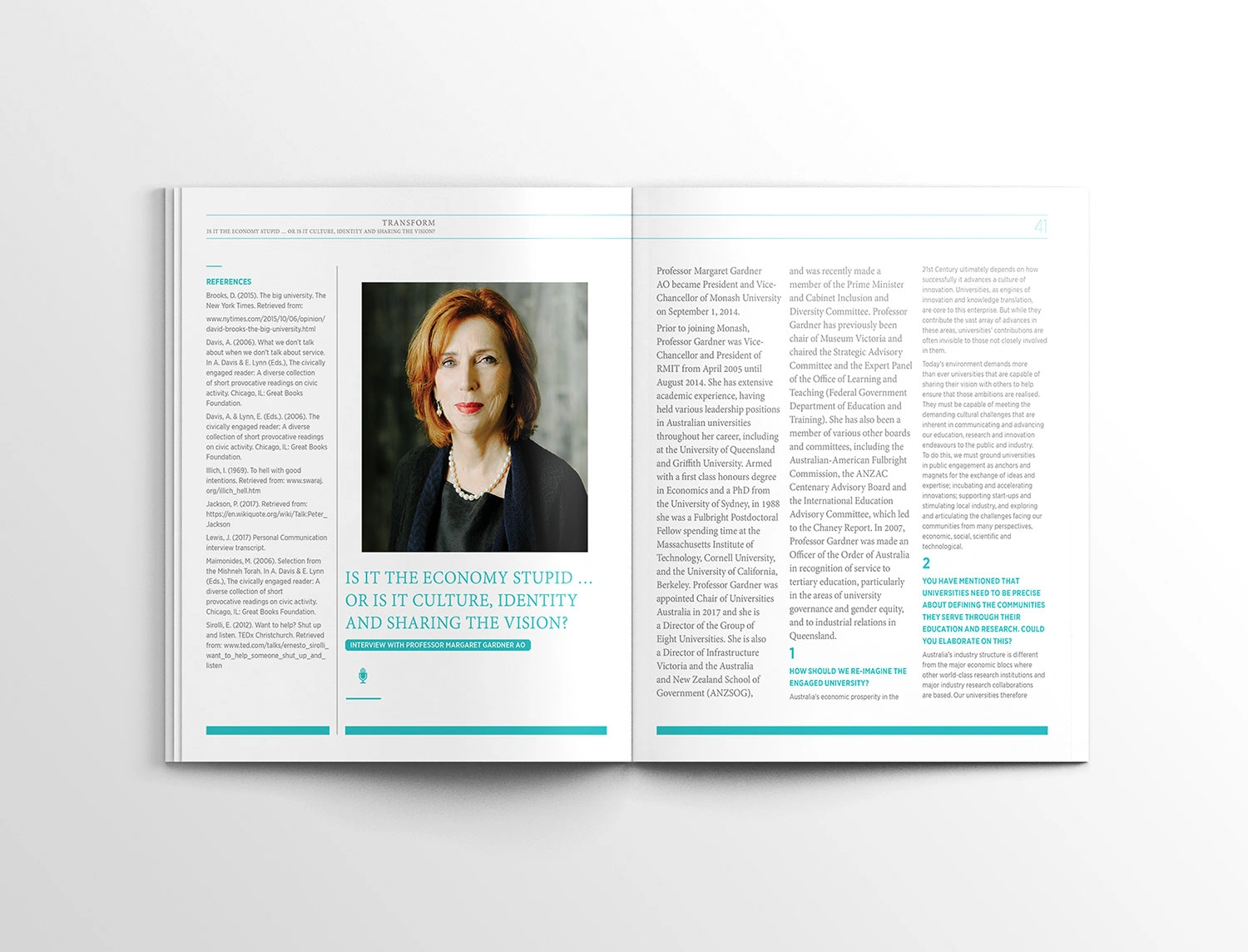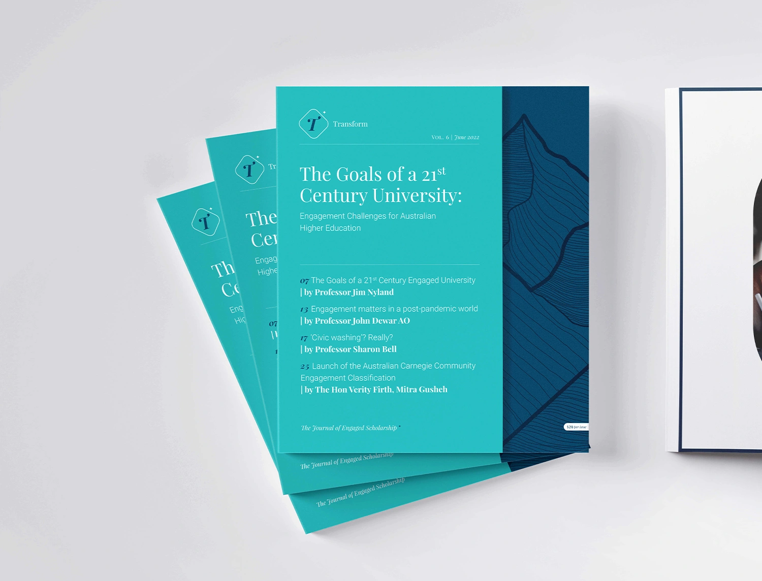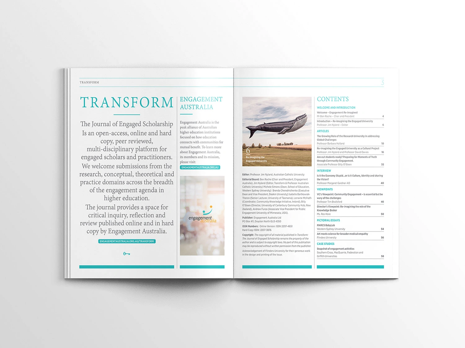 Engagement Australia produces an annual journal entitled 'Transform' which Hughes was tasked with redesigning. The design challenge was to reflect the information in a scholarly and premium style that would elevate the institutions and excite the reader.
