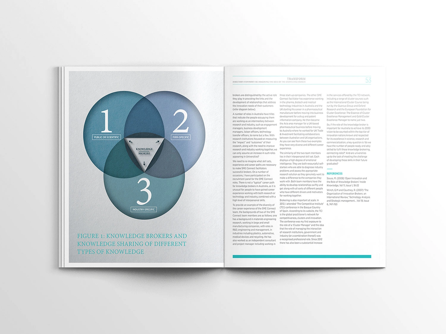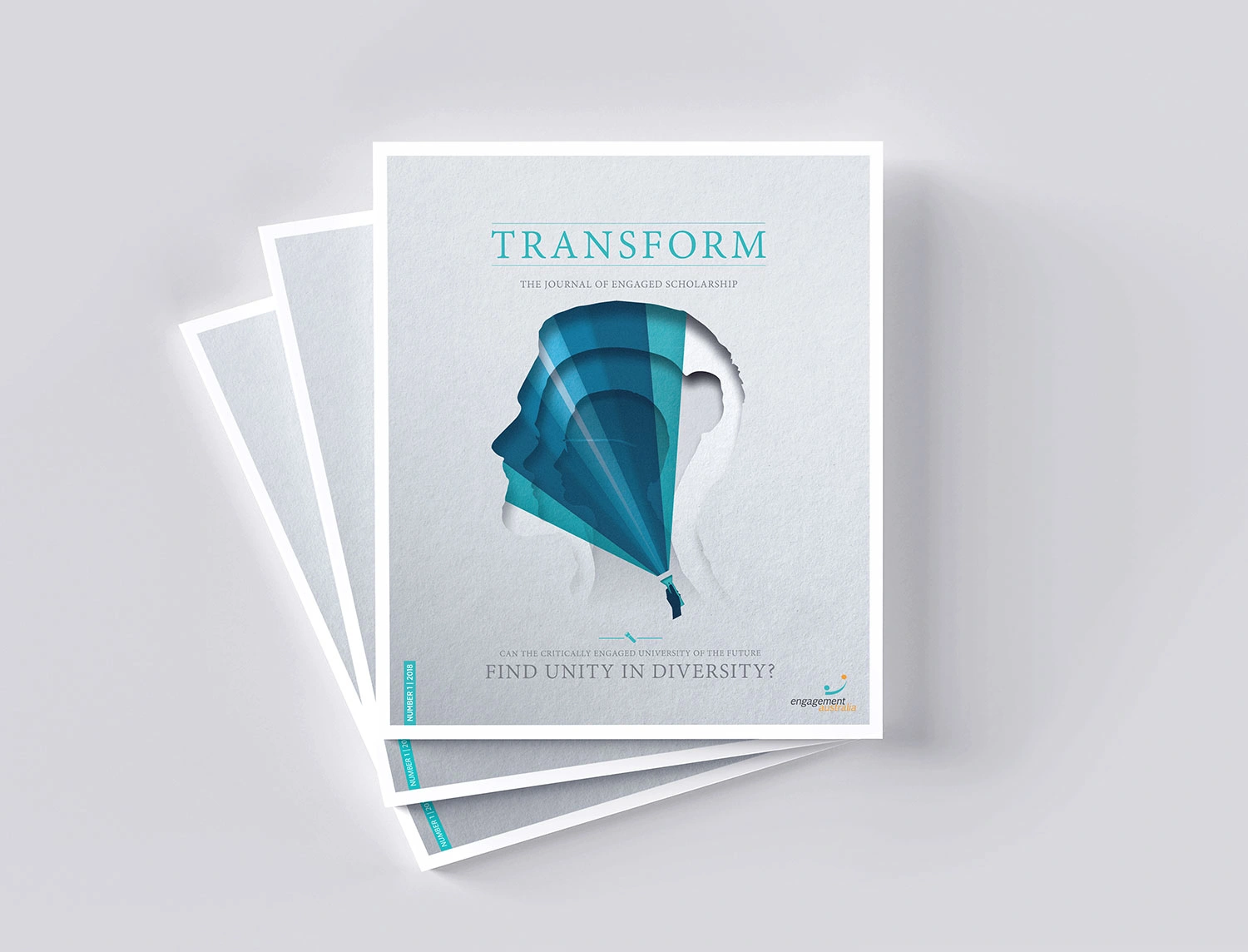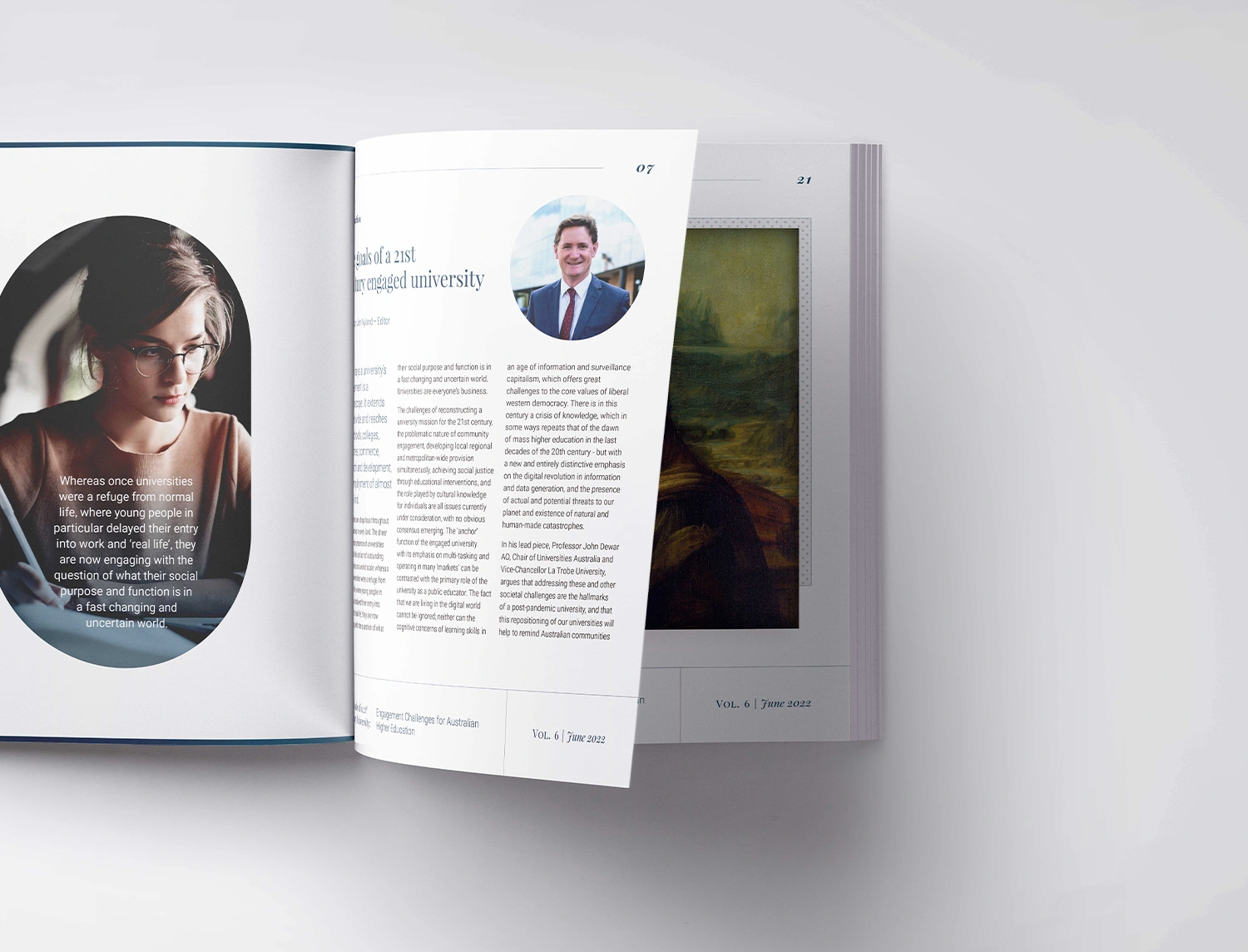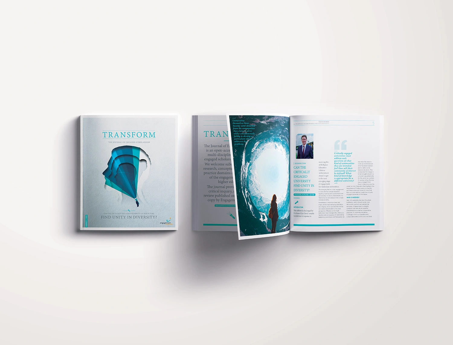 Engagement Australia produces an annual journal entitled 'Transform' which Hughes was tasked with redesigning. The design challenge was to reflect the information in a scholarly and premium style that would elevate the institutions and excite the reader.