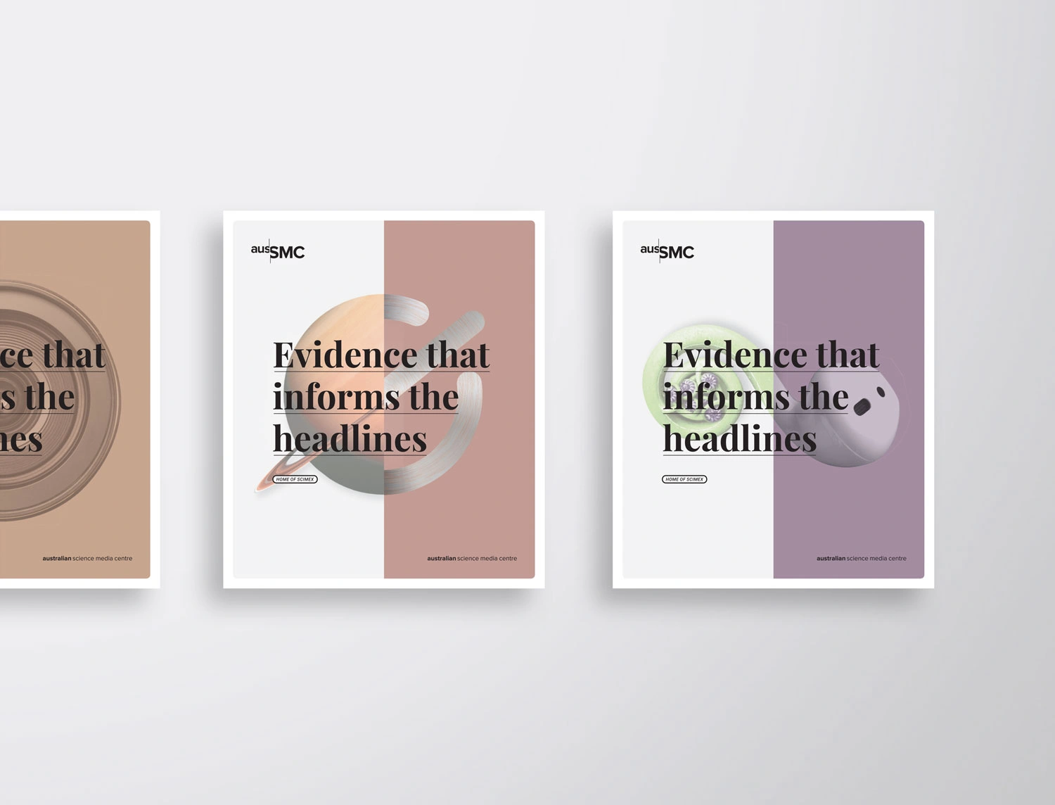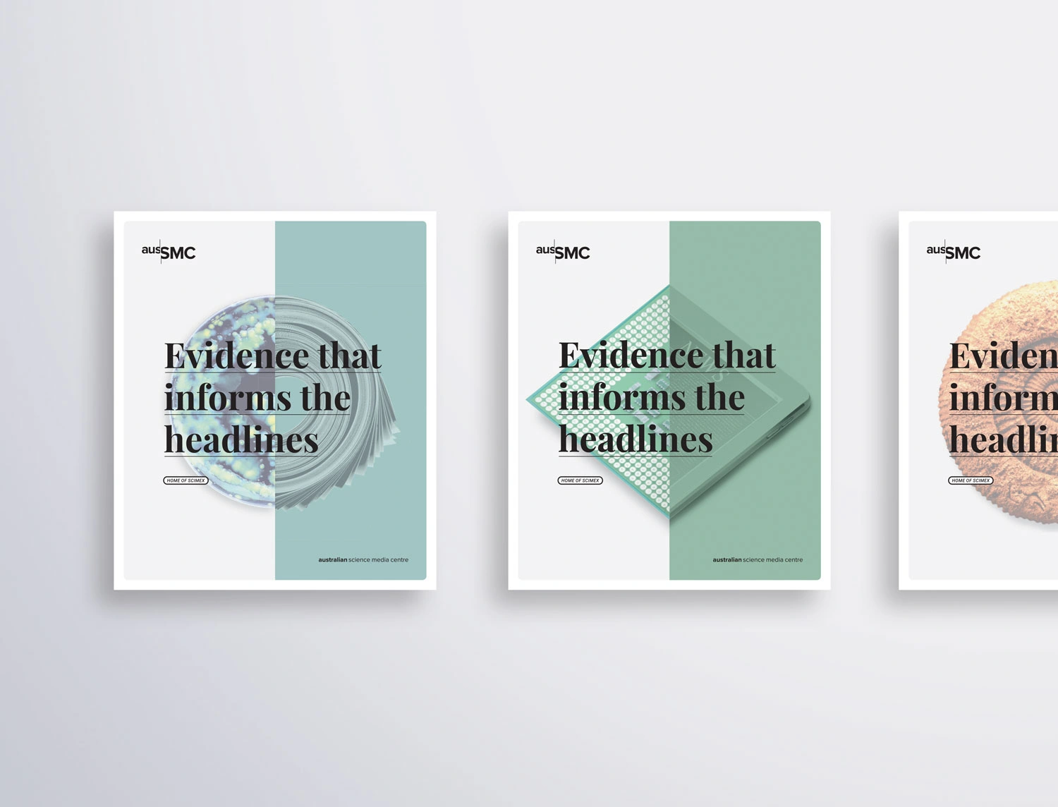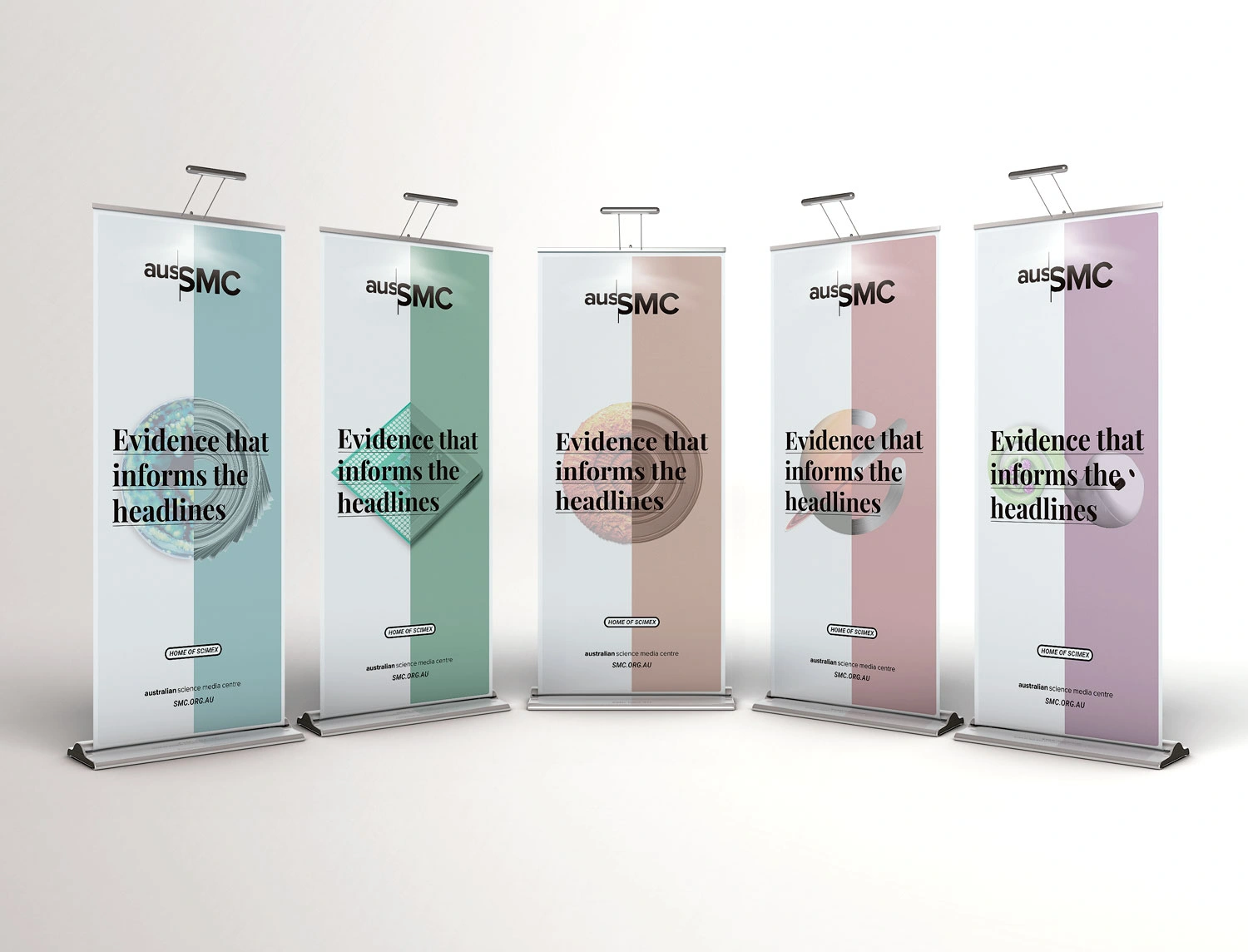 Initially working with Hughes to refine their marketing strategy going forward, a positioning statement was developed which would appear on their core marketing material; ‘Evidence that informs the headlines’. Five key distinctive brand assets were then developed. These were striking visuals which told the story of the unusual intersection between science and media, that the AusSMC facilitates. These devices would also provide a platform for the slogan to be displayed. The logo colours were pared back to a flat black to contrast a new colour suite. These colours helped reflect the progressive nature of science, their human and community focus, as well as creating greater flexibility across their diverse areas of delivery.