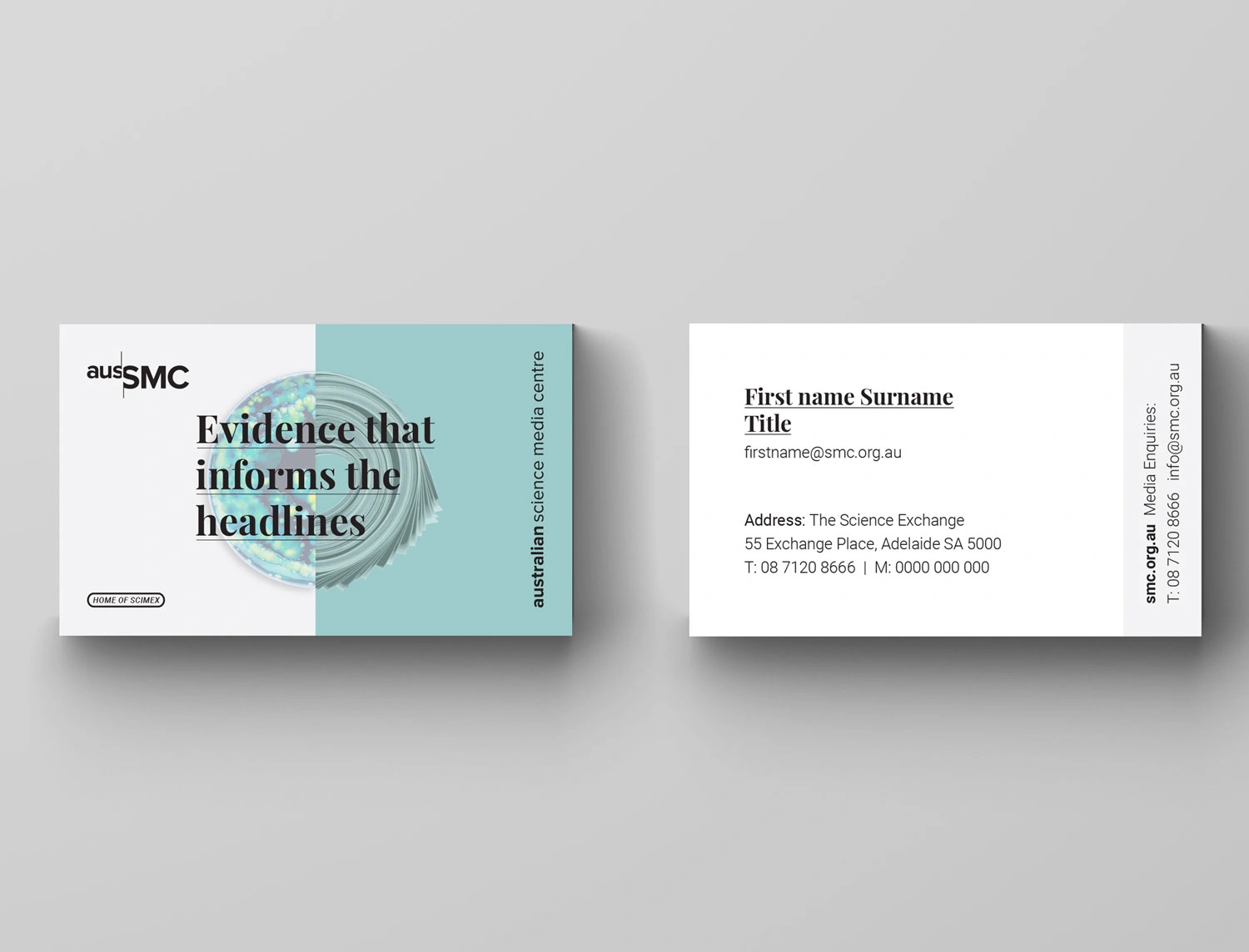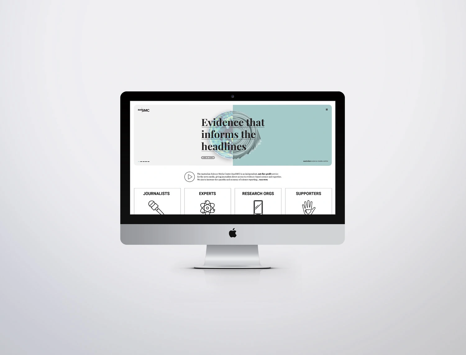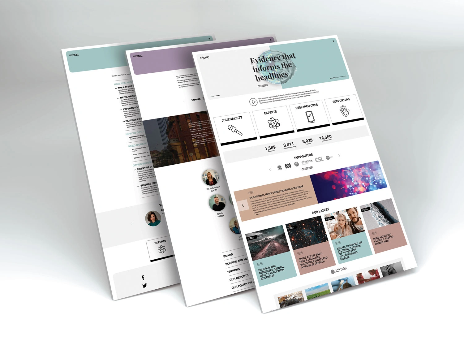 Initially working with Hughes to refine their marketing strategy going forward, a positioning statement was developed which would appear on their core marketing material; ‘Evidence that informs the headlines’. Five key distinctive brand assets were then developed. These were striking visuals which told the story of the unusual intersection between science and media, that the AusSMC facilitates. These devices would also provide a platform for the slogan to be displayed. The logo colours were pared back to a flat black to contrast a new colour suite. These colours helped reflect the progressive nature of science, their human and community focus, as well as creating greater flexibility across their diverse areas of delivery.
