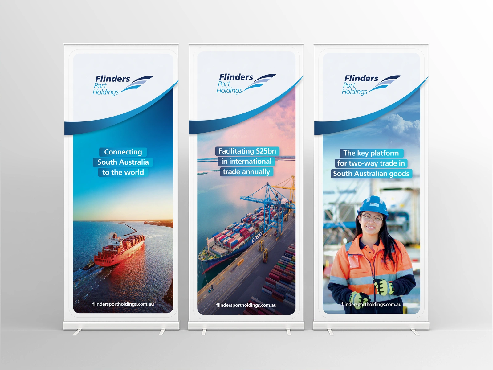 Over several years, Hughes collaborated closely with Flinders Port Holding to modernize their branding, aligning it with their vision and values, and establishing them as the leading port holding group connecting South Australia to the world. This effort extended across various mediums, including infographics, brochures, corporate documents, videos, signage, photography, social media, and their six websites, enhancing their visual identity.