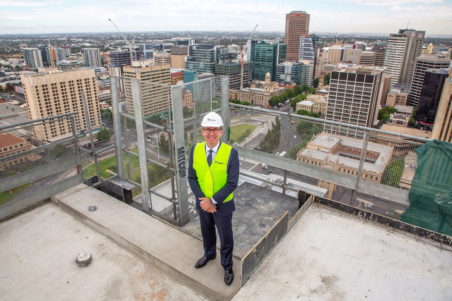 South Australian Minister for Planning Stephan Knoll MP was among guests to gather on the top floor of the 30-storey building – which rises 103m – for a topping out ceremony to celebrate the installation of the highest point of the $100 million development.