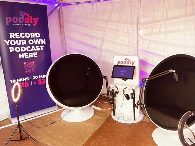 Poddiy comprises two acoustically-padded retro moon chairs and a ‘poddiyum’ fitted with professional RODE recording equipment. Future podcasters simply find a pod, enter their details and hit record.