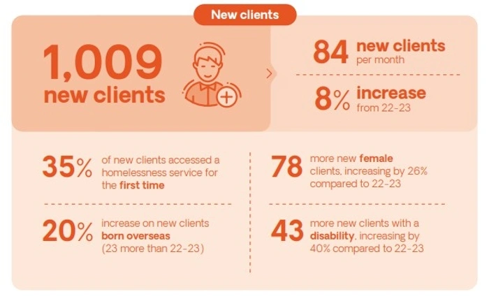 Releasing its annual data report for the 2023-24 financial year, Hutt St Centre welcomed its second consecutive record number of new clients presenting - with 1,009 people - an increase of 8 per cent on the 2022-23 financial year, and averaging 84 new people visiting each month.
