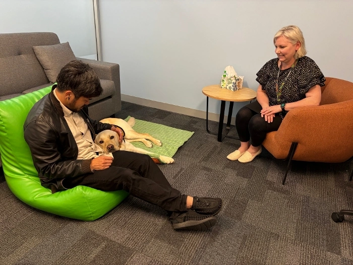 “I instantly feel calmer from having Marley in the office and I’m excited to have Marley in sessions with young people,” Centre Manager and handler Ingrid Puise said. “The look of happiness on young peoples’ faces when they see Marley is priceless.”